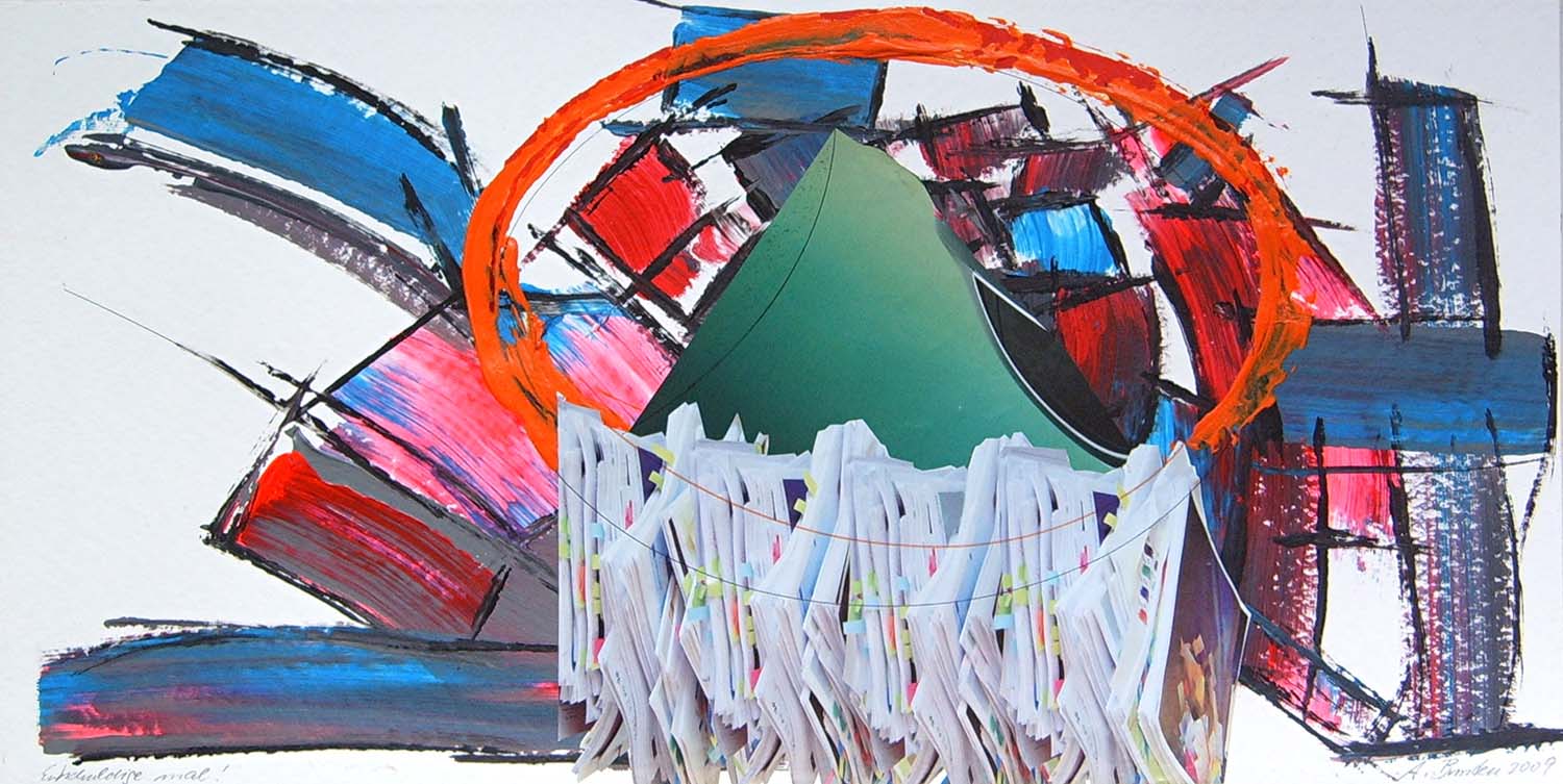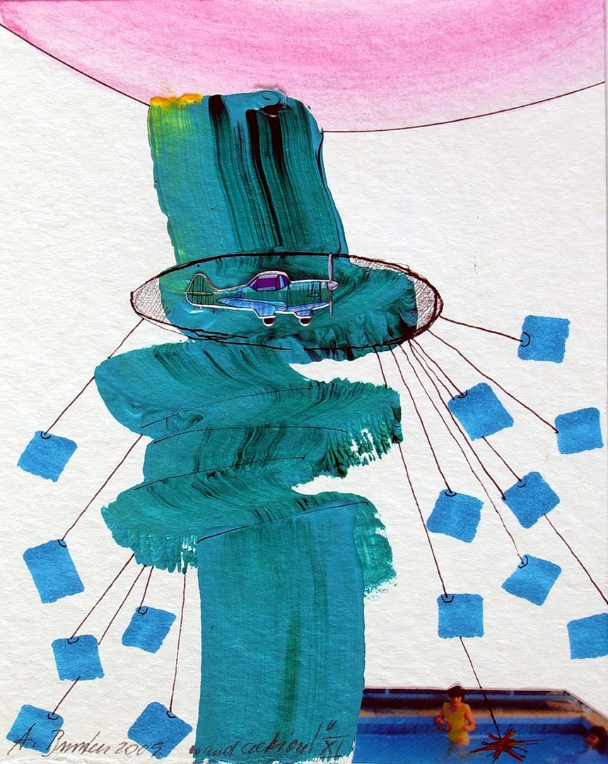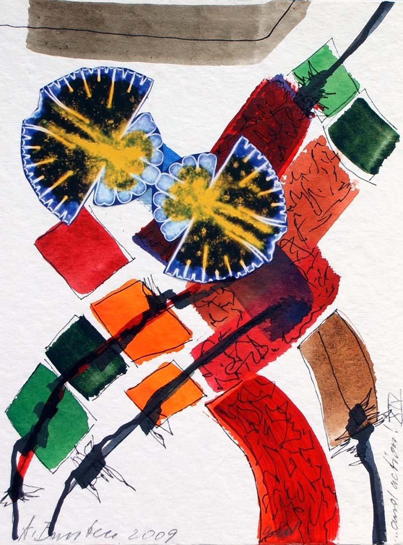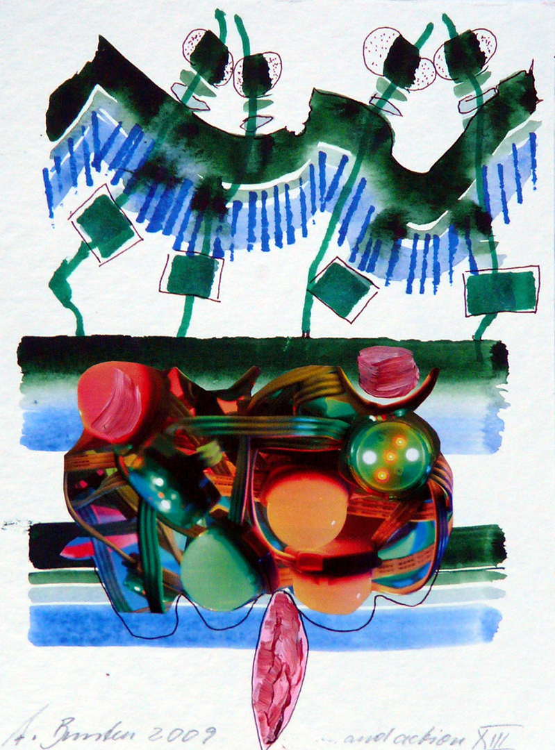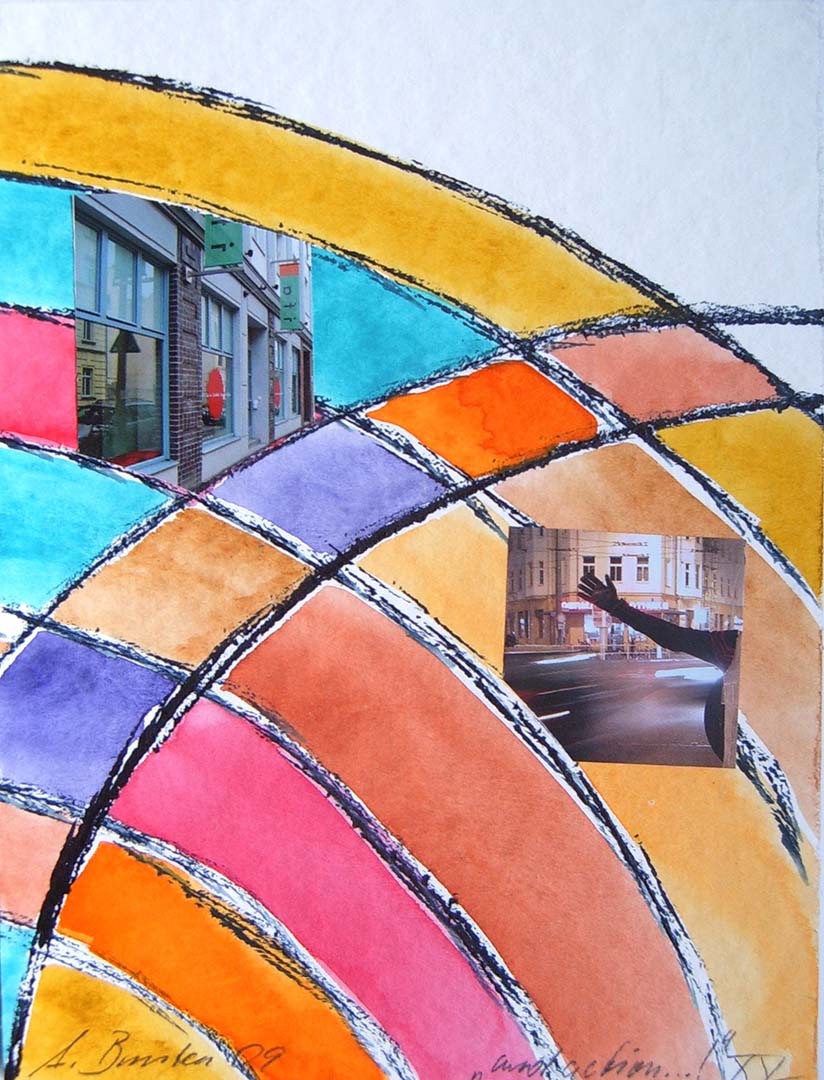 and action XXI, 2009, Aquarell-Collage, 15x20