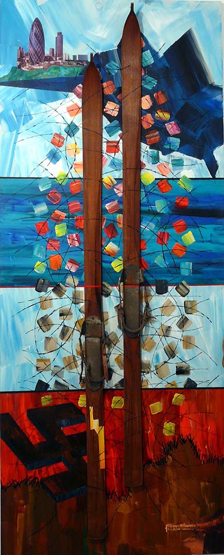 Meines Vaters Skier, 2009, Acryl auf Leinwand und Skier, 220x100