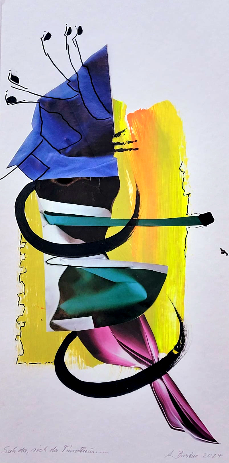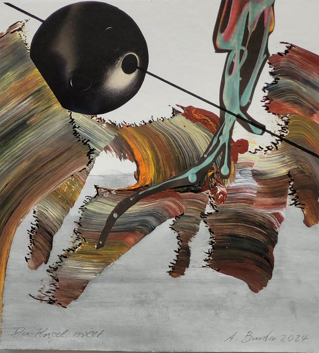 Die Kugel rollt (2024) 27,5 cm x 30cm, Acryl auf Papier, Collage + Tusche