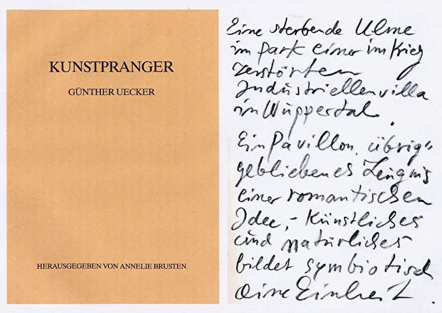 Der Katalog erschien 1985 anlässlich einer Ausstellung von Günther Uecker mit dem Titel 'Kunstpranger' in der Galerie Annelie Brusten. Er hat ca 50 Seiten, herausgegeben von Annelie Brusten, mit 45 Fotos von Herbert Koller und handgeschriebenen Texten von Günther Uecker über die Entstehung des 'Kunstprangers'